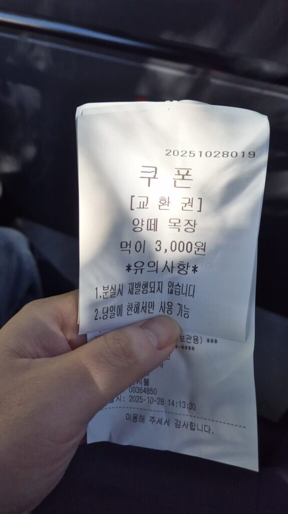 위에 도착하자마자, 양 먹이 쿠폰을 가지고,
