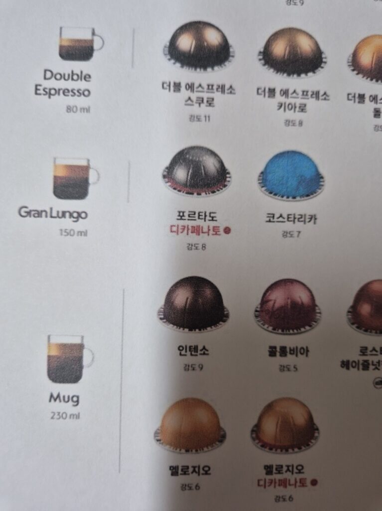 캡슐 커피의 강도 숫자가 높으면 높을수록 커피의 쓴맛이 강하다고 보시면 됩니다.