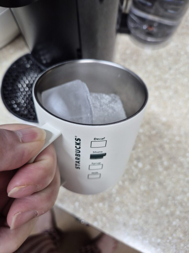 - 커피 잔에 얼음을 담습니다.