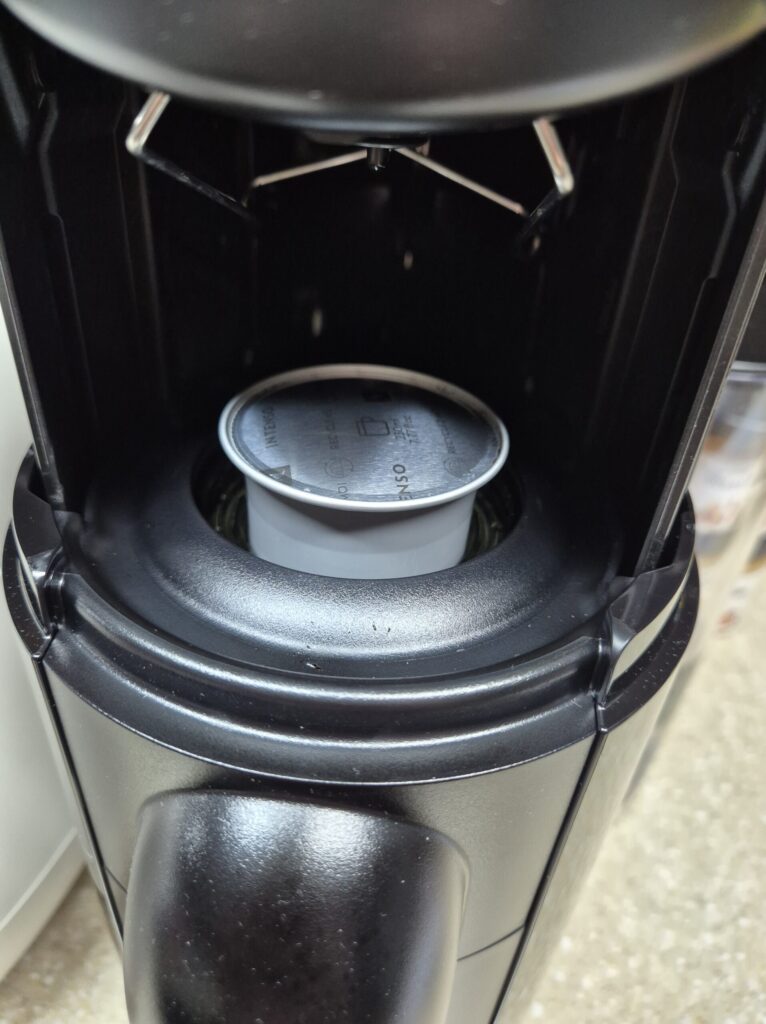 - 그리고 헤드 오픈된 부분에 캡슐커피를 넣습습니다. 캡슐의 둥근부분이 아래로 해놓고, 은색 레버를 아래로 누르면, 뚜껑이 닫힙니다.