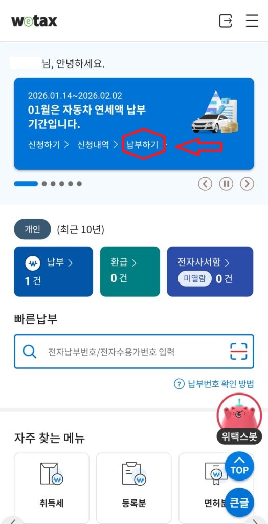4. 로그인이 완료되면, 첫화면에서 자동차세 “납부하기”를선택해주세요.