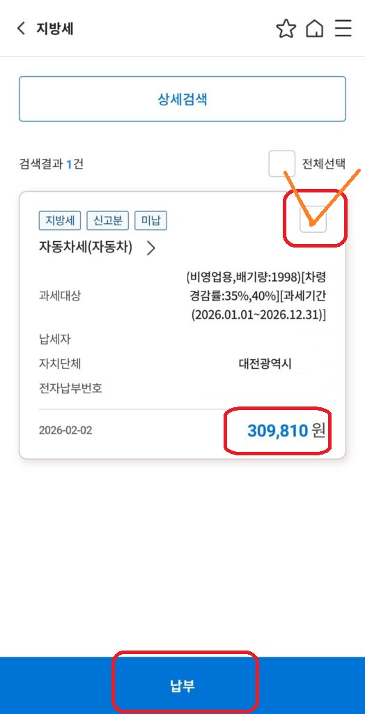 5. 검색된 납부할 내역이 나옵니다. 체크후 아래 “납부”를 선택하세요