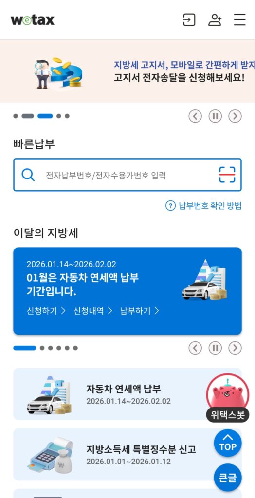 편하게 위택스를이용해서 자동차세를 납부 하시기를 권해드립니다.