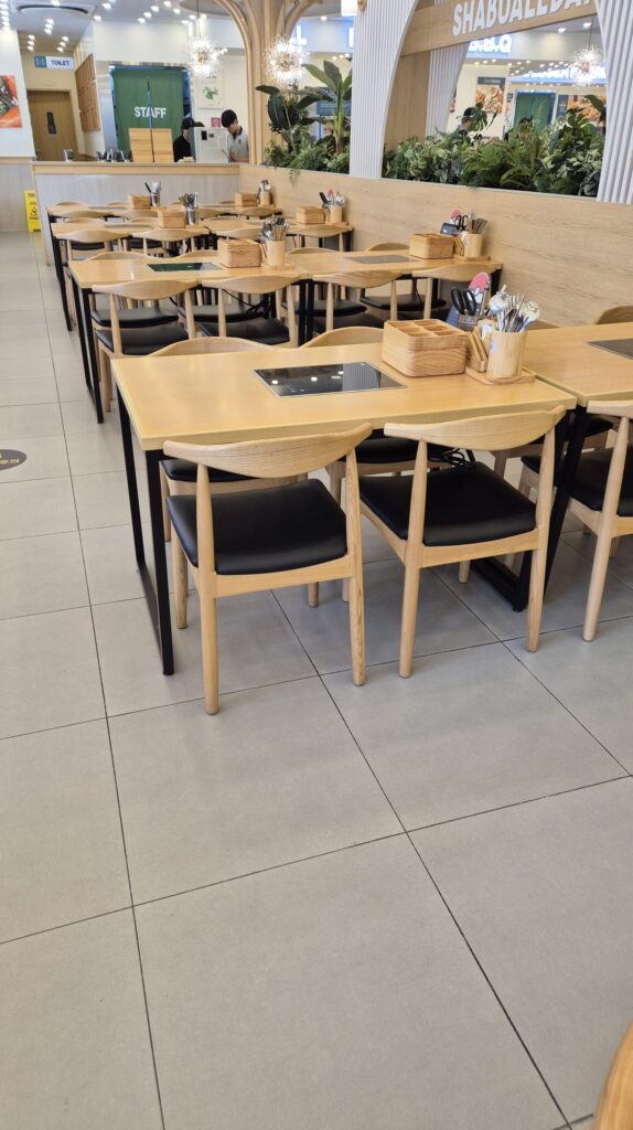 모든 테이블에는 샤브를 먹을수 있게 샤브 냄비가 올라갈수 있게 전기스토브가 세팅되어 있고, 샤브용 쌈채소 나무 접시들이 세팅되어 있습니다.