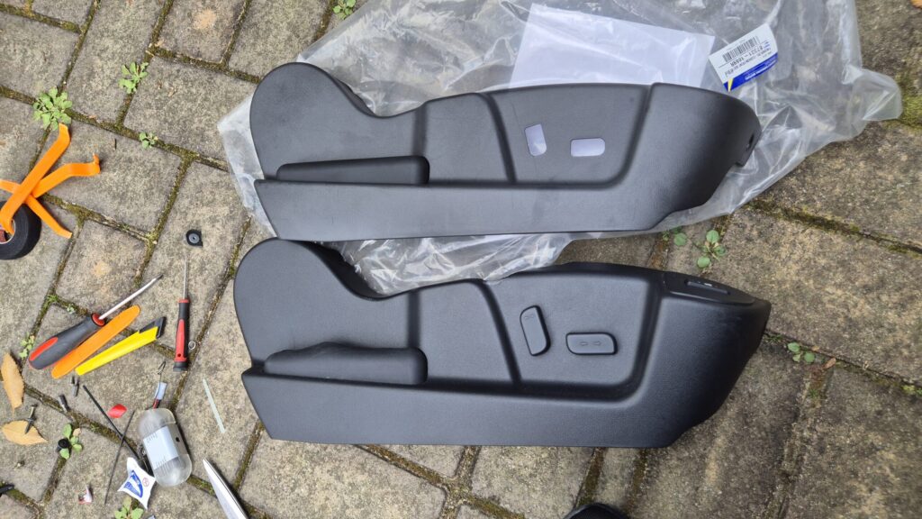 새로산 SM7 시트 사이드커버에 기존 부품 2개 이식 완료함. - 역순으로 설치를 진행한다.