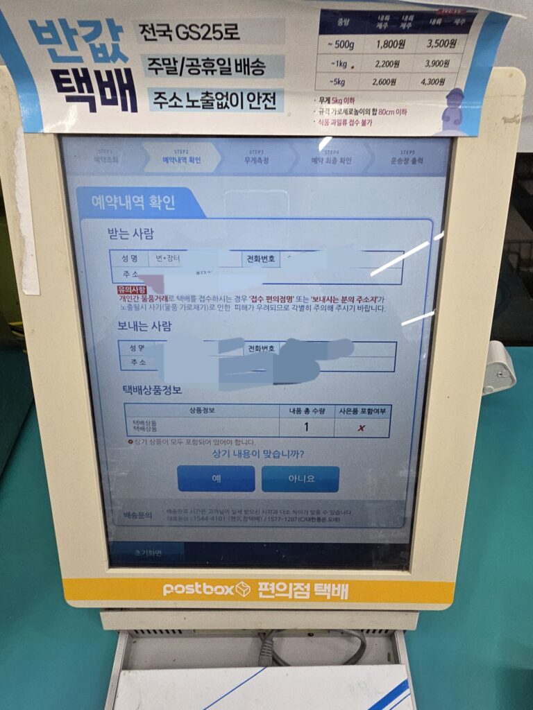 - 제품 포장을 하고, 근처 편의점 택배기 앞에 서고 예약 번호를 누르고 택배비를 지불한다. 난 4천원 초반대 택배비가 나왔음.