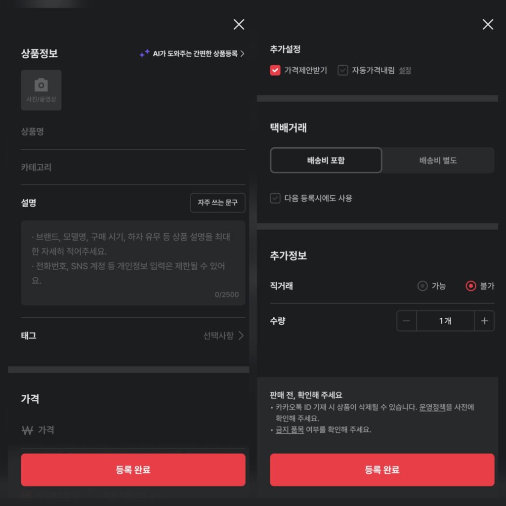 - 판매할 물건을 등록하고, 사진 및 내용을 기재한다.