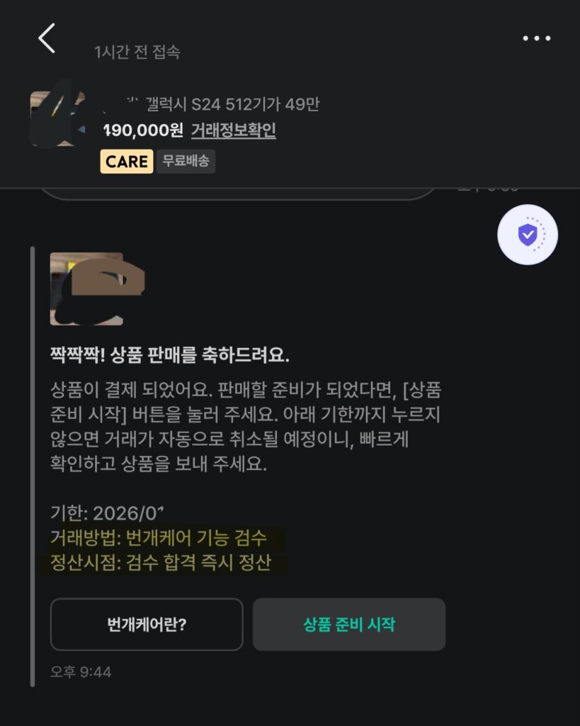 - 구매할 분들이 연락이 오고, 물건에 관해 이야기를 나누다가 구매자가 번개케어로 구매를 한다.