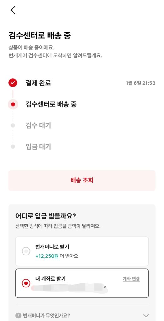 번개케어 판매는 중간에 번개장터가 검수하는 과정이 있고, 검수만 통과를 하게 되면, 바로 판매자에게 바로 판매 대금을 송금해줍니다.
