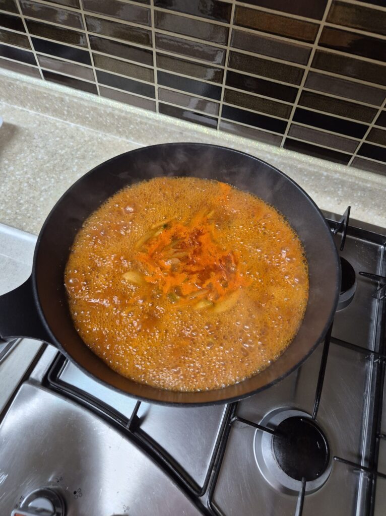 이연복 짬뽕탕은 2봉지가 들어가있음. - 짬뽕탕 봉지 2개를 궁중펜에 넣고, 쎈불로 4분간 끓여줍니다. (전 여기에 물 100ml를 추가했습니다. 그냥 먹으면 제 입맛에는 짜서;;)