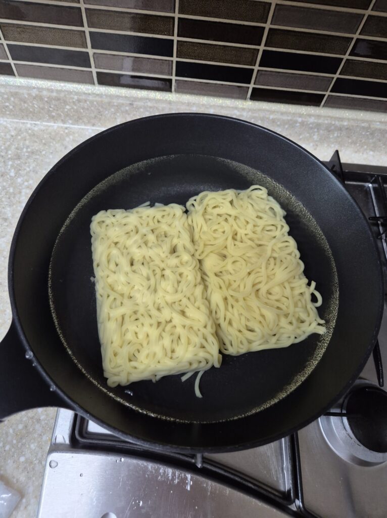 - 끓는 물을 냄비에 준비하고, 냉동실에서 꺼낸 면을 넣고, 2분간 삶아주고, 면은 짬뽕을 먹을 대접 그릇에 옮겨주세요.